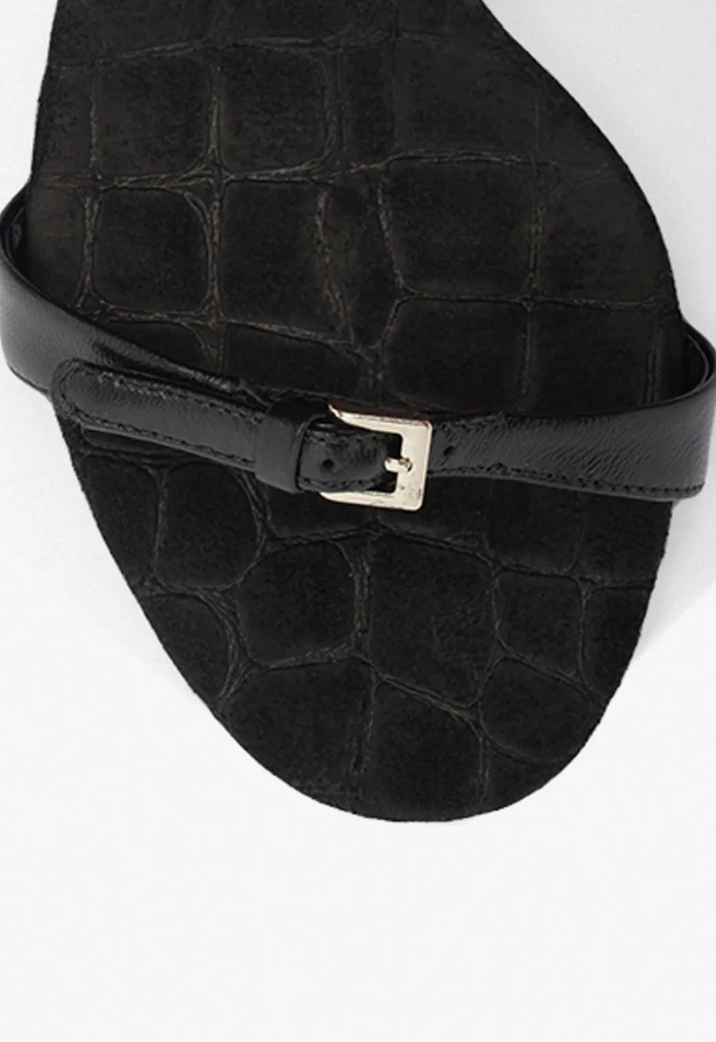 Aurora’s mid-heel edition still knows how to turn heads. Its black-hued leather is smooth to the touch and versatile on the foot, giving you a polished finish from day to night. The front strap features a tiny buckle for a flash of edge, balanced by a strap that secures your stride. Whether you’re brunching, boardroom-ing, or bar hopping, this pair’s got you.