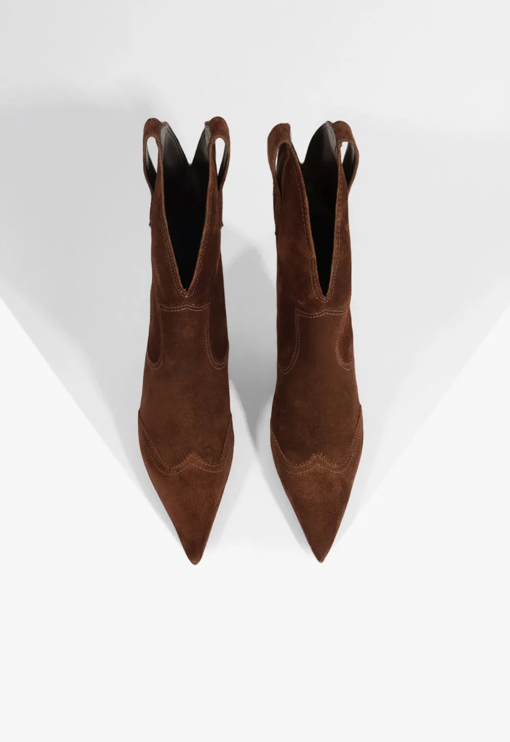 Maryann is the boot that breaks the rules—featuring Western roots, fashion-forward curves, crafted in deep brown suede, and a sharply pointed finish. The arched heel brings an architectural twist, while the black-on-black look keeps things clean and grounded. It’s all about tension: heritage shape, sculptural edge. Pair with wide-leg pants, midi skirts, or tonal leather for maximum impact. This boot doesn’t follow trends because it sets the tone automatically.