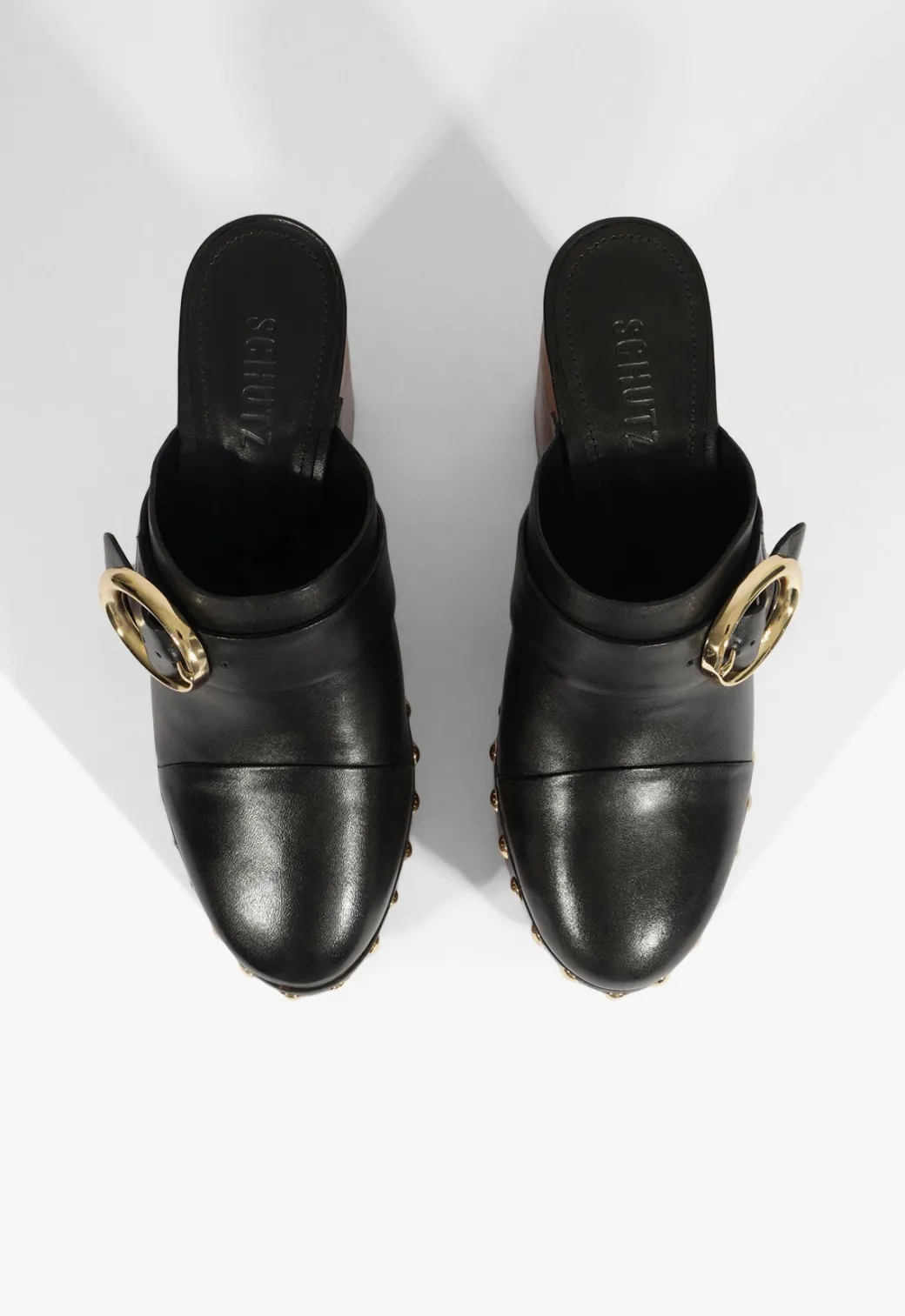 Piper takes the classic clog and elevates it with sculptural wood soles, metallic stud work, and a bold black leather upper. A round gold buckle adds polish to the vibe. These were made for stomping through your day with zero apologies. Style them with flowy dresses, tailored sets, or raw-hem denim.