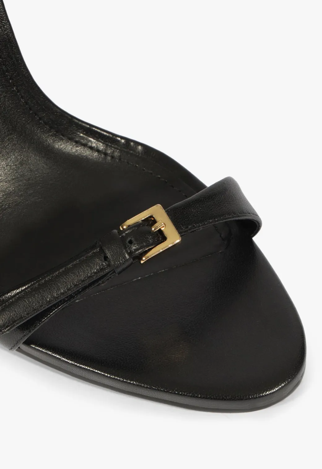 The Aurora sandal is all about clean lines and confident curves. Crafted in smooth black leather, it wraps the foot with minimal finesse. A slim strap and a delicate ankle buckle keep the silhouette sharp. Rising on a high slender stiletto heel, this pair is made for leg-lengthening moments, perfect for wearing with an evening dress or oversized tailoring.
