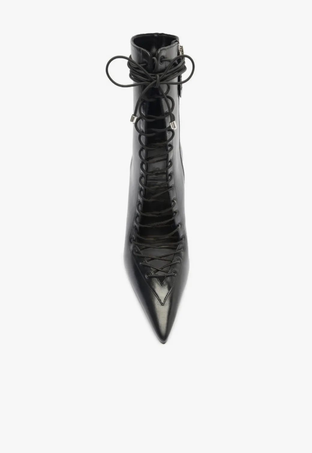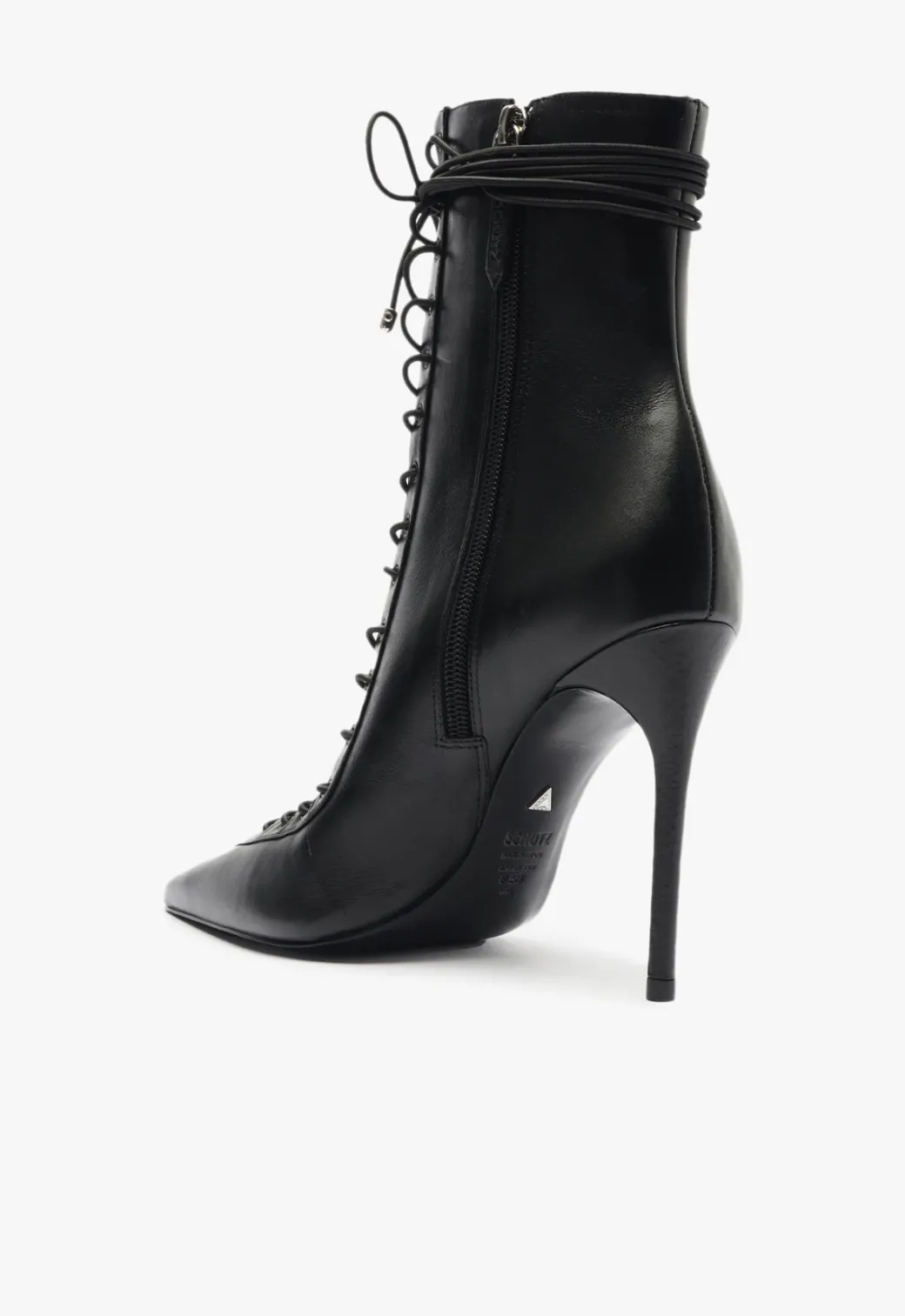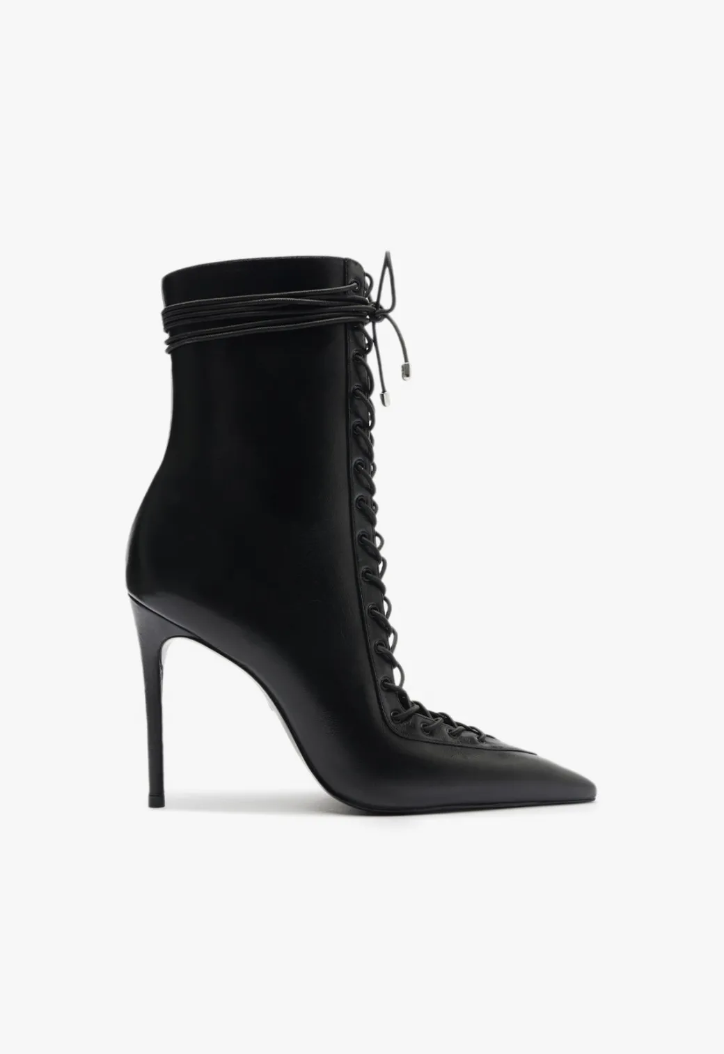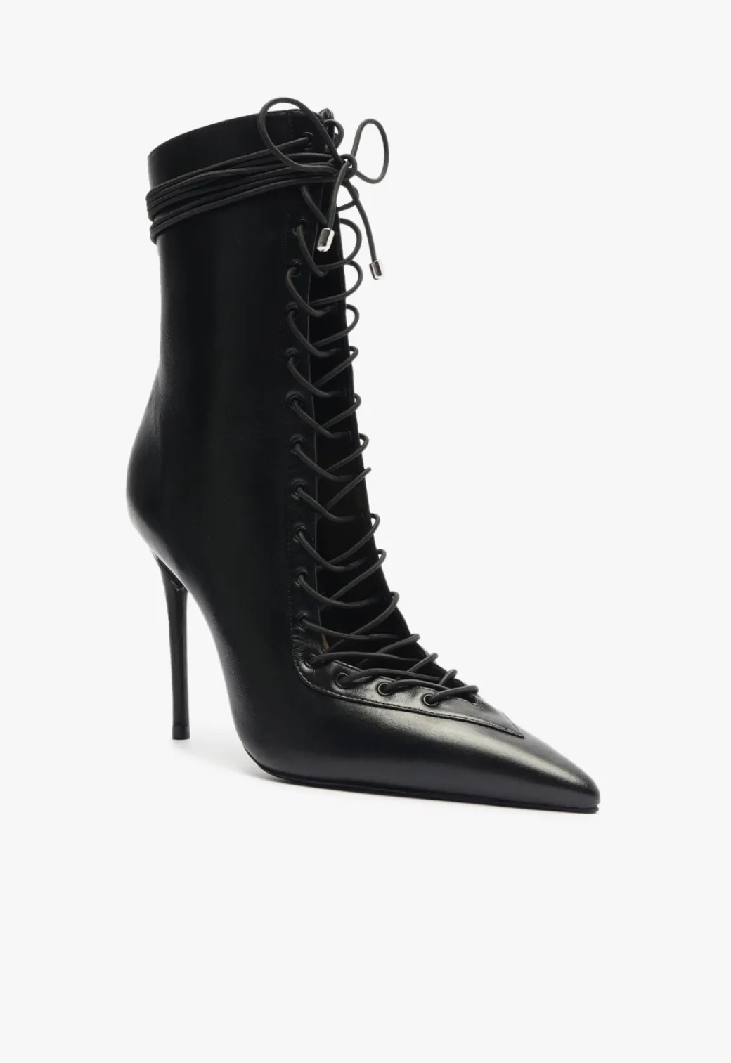 These lace-up booties bring a severe attitude with their sharp pointed toe and towering stiletto heel. The glossy finish amps the bold factor, while the lace-up front adds a rebellious edge. With a sleek, form-fitting ankle design, these booties are built to command attention. Whether taking over the streets or setting the night on fire, these boots are the perfect power move for anyone looking to add some unapologetic edge to their look.