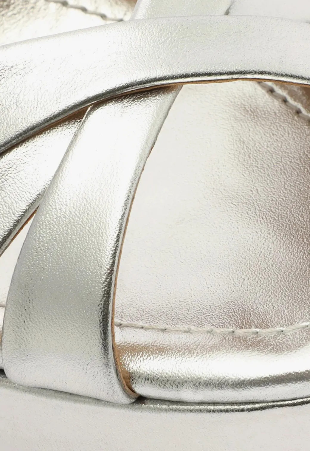 Crafted with a luxurious metallic silver leather, this sandal features a slim block heel, adjustable ankle strap, and criss-cross straps for a stylish look. Ultimately, the Keefa High Nappa Leather Sandal will keep you comfortable and fashionable for any occasion.