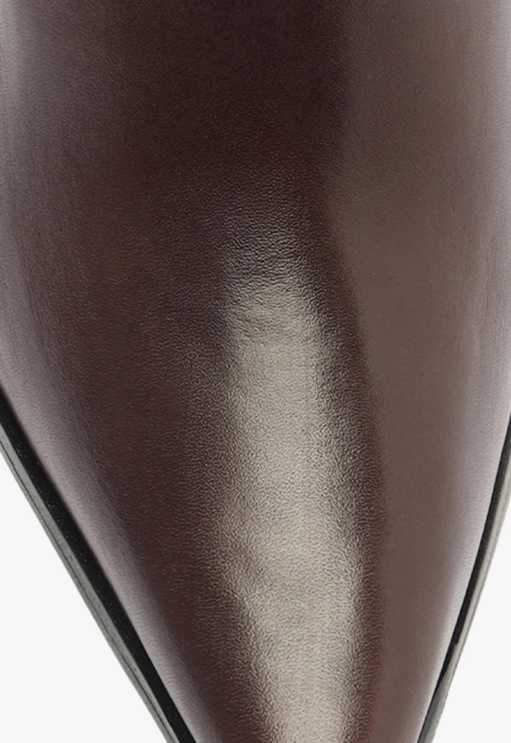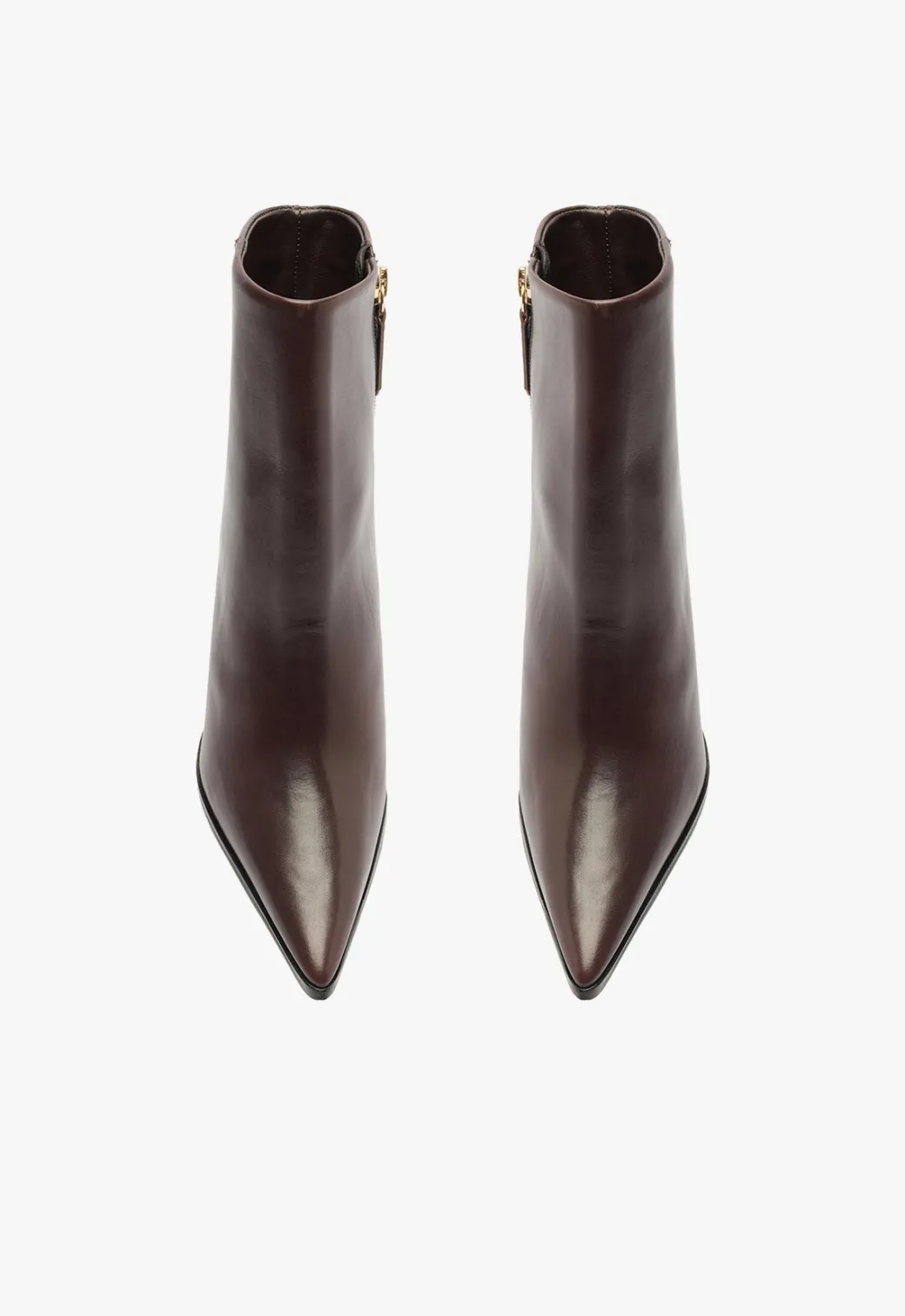 The Mikki block-heeled bootie features a sleek, modern design with a pointed toe, giving it a sharp and elegant look. Th…