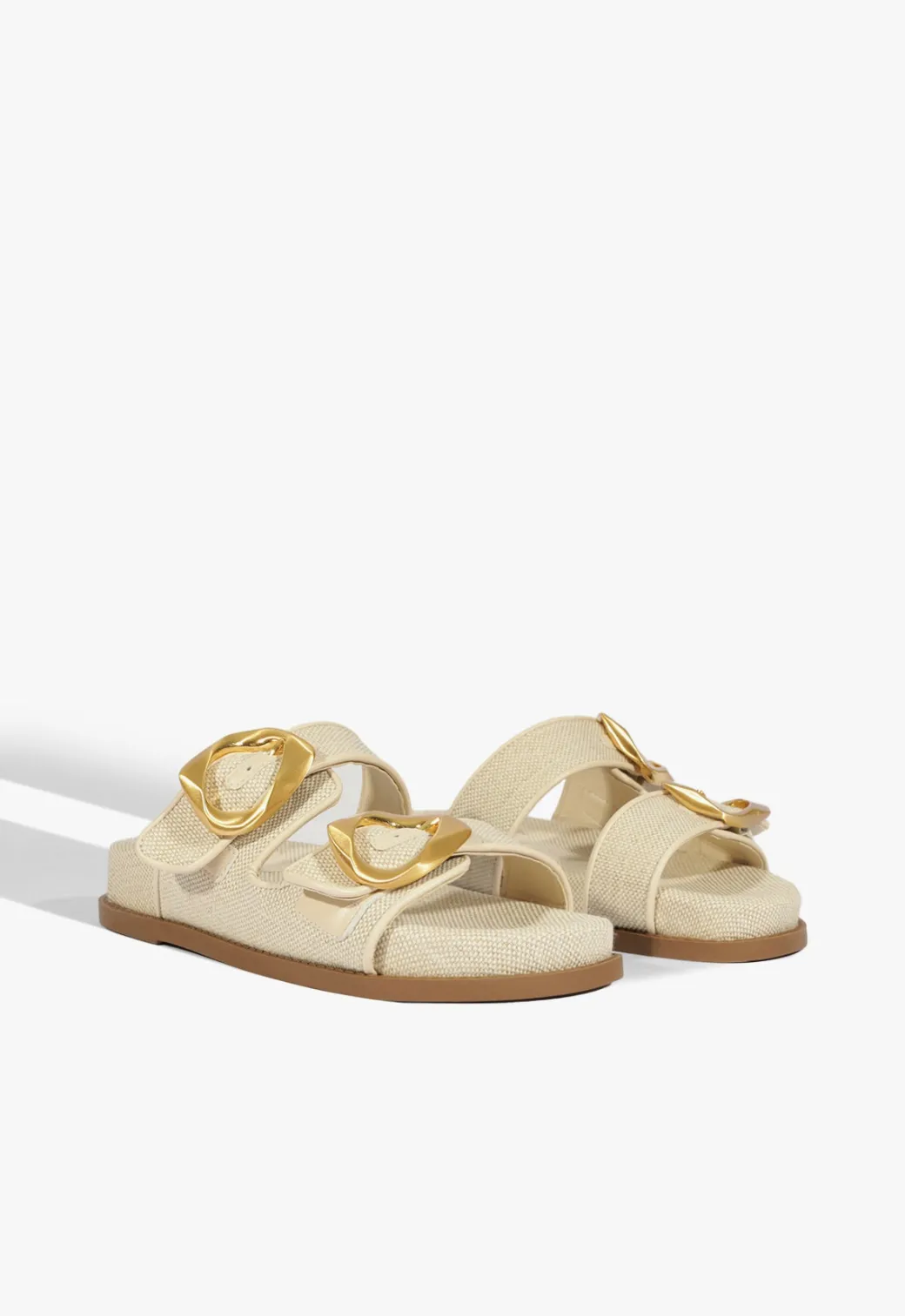 Unbuckle the cool with the Olga sandals; they prove that casual doesn’t mean boring. Luxe gold hardware gives these easy slides an unexpected twist. Wear them with joggers, cutoffs, or a slip dress because they play well with everything as they aren’t your ordinary, easy-to-wear pair of sandals.