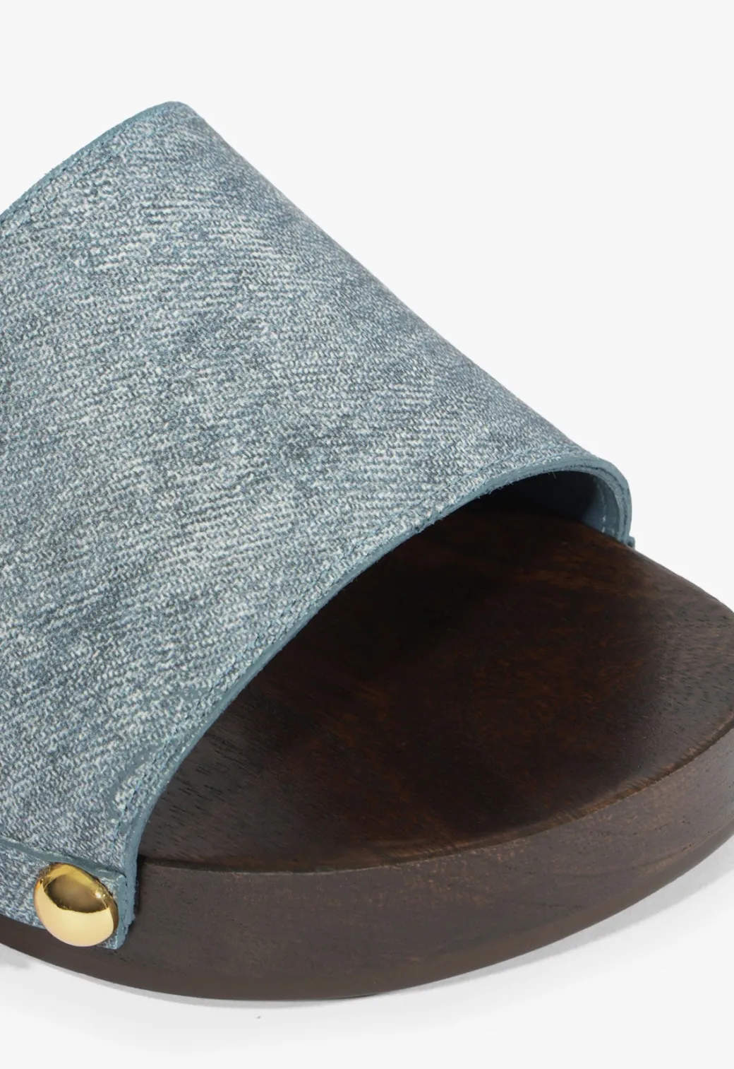 Shayla takes smooth blue leather and turns it into something modern. The contrast print pops against a chunky studded sole, making this sandal feel part cool, part craft. The wood-inspired footbed adds a touch of earthy structure. Slip it on with oversized shirts or minimalist basics. It’s the kind of unexpected detail that pulls a whole look together.